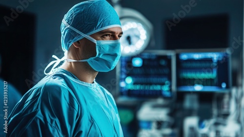 Surgeon in scrubs and a mask preparing for an operation in a high-tech operating room