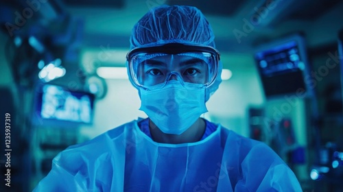 Surgeon in scrubs and a mask preparing for an operation in a high-tech operating room
