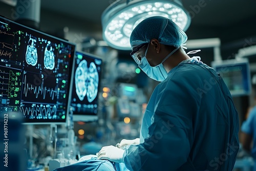 Surgeon Performing Delicate Robotic Surgical Procedure Using Imaging Monitors and Sterile Medical Technology