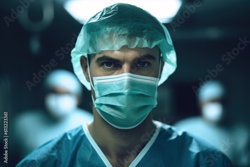 Surgeon wearing surgical mask and cap in operation room. Head shot. Generative AI