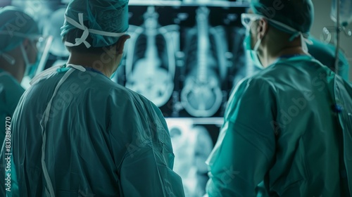 Surgeons discussing over medical X-ray images - A group of surgeons in scrubs are intently discussing X-ray images displayed on a monitor in an operating room