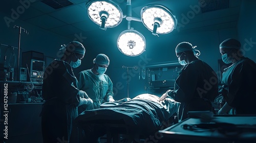 Surgeons operating under bright surgical lights. Cesarean section in high-tech hospital. Medical expertise and teamwork ensuring safe childbirth procedure in sterile environment