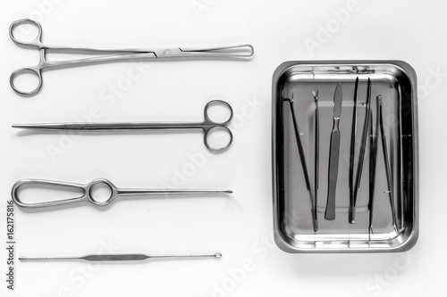 Surgical instruments and tools including scalpels, forceps and tweezers on white table top view