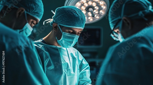 Surgical Precision: A team of highly skilled medical professionals, clad in surgical scrubs and masks, collaborate with focused intensity in a sterile operating room