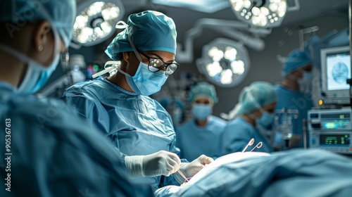 Surgical Team Performing Intricate Procedure in Operating Room Under Bright Lights. Generative AI