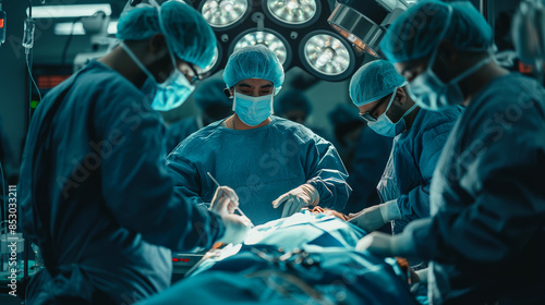 Surgical team performing operation. Medical professionals in the midst of a surgery in a well-lit operating room. Suitable for healthcare, medical education, and professional training resources.