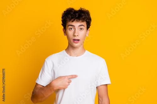 Surprised young male student with curly hair pointing at himself while standing against a vibrant yellow background
