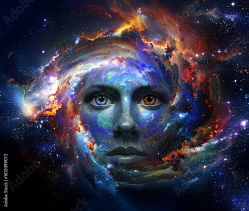 Surreal abstract face merging with a vibrant cosmic nebula, bursting with stars and colorful clouds. Represents the universe within, dreams, and boundless imagination.