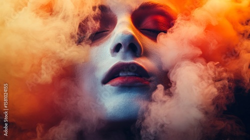 Surreal artistic portrait of woman face emerging from colorful fog for abstract conceptual fashion photography background scene