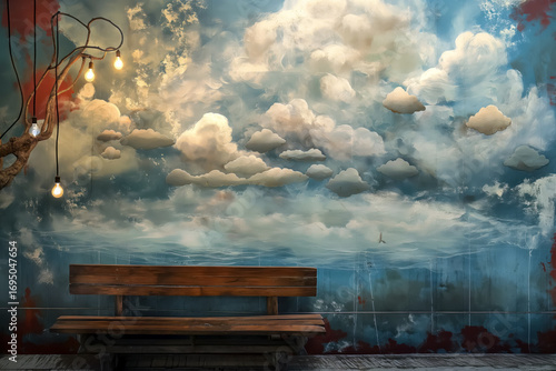 Surreal bench under painted sky with glowing light bulbs and floating clouds