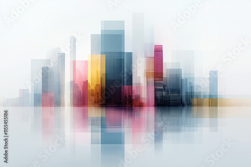 Surreal Cityscape with Vibrant Geometric Skyscrapers Reflecting on a Misty Horizon