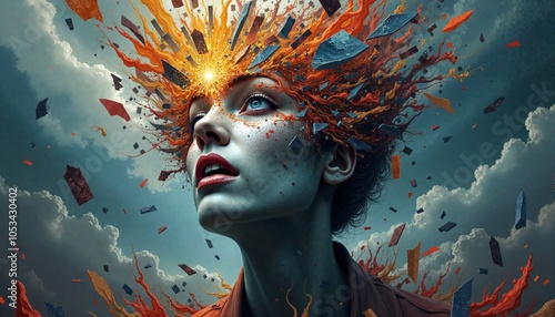 Surreal Conceptual Portrait of Woman with Explosive Thoughts and Mental Distress, Symbolizing Inner Turmoil and Emotional Struggle