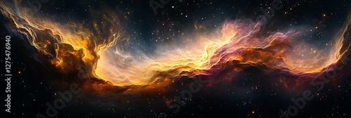 Surreal deep-space landscape of an interstellar nebula with gaseous tendrils stretching across the cosmos, painted in otherworldly shades of pink and gold