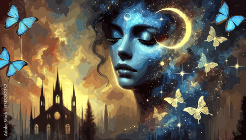 Surreal digital painting of a celestial woman with a crescent moon on her face, glowing butterflies, a gothic castle, and a cosmic night sky. Dreamlike, mystical, and enchanting.
