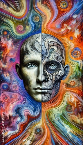 Surreal Duality Artwork: Half Human, Half Mechanical Face Surrounded by Colorful Abstractswirls symbolizing the merge of Technology and Humanity