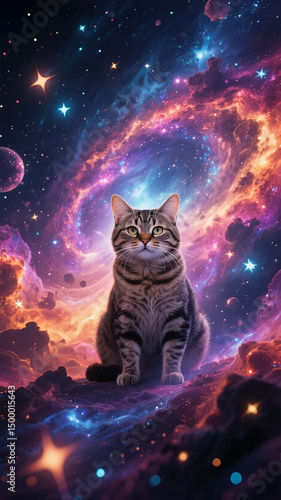 Surreal galaxy cat floating against a cosmic background filled with stars and nebulae. Vibrant 4K wallpaper ideal for fantasy art, digital design, social media, and creative projects.