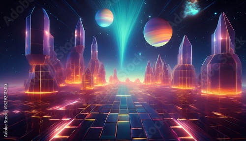 Surreal glowing geometric shapes, floating in space like a digital aurora, radiating vibrant colors and creating a mesmerizing, futuristic atmosphere.