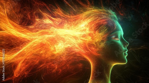Surreal glowing representation of a woman with fiery hair surrounded by vibrant colors at twilight
