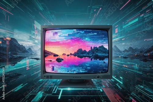 Surreal Pixel Glitch Illusion Abstract Background Montage with Vintage CRT Display and Cybernetic Dystopian Landscape