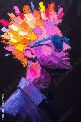 Surreal portrait of a human figure adorned with vibrant abstract shapes, hyperrealistic detailing,