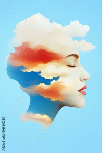 Surreal portrait of a woman's face blended with colorful clouds against a blue sky.