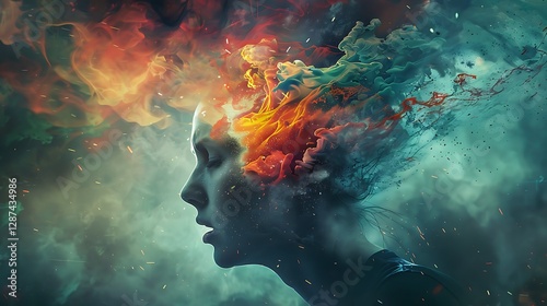 Surreal Portrait of Woman with Colorful Smoke and Flames Emanating from Head in Dreamlike Scene