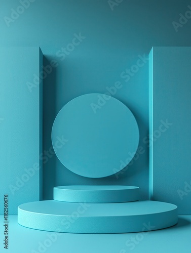 Surreal product display stands turquoise background high-resolution imagery artistic environment minimalist viewpoint