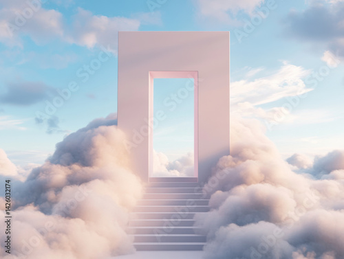 surreal scene featuring staircase leading to door in clouds, evoking sense of wonder and mystery. soft clouds and bright sky create dreamlike atmosphere