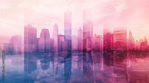 Surreal urban landscape with dreamy hues reflecting in water, creating a serene and abstract cityscape view.