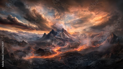Surreal volcanic terrain with molten lava rivers, glowing red-orange hues contrasting with dark basalt, cinematic framing capturing dramatic energy and scale