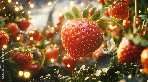 Surrealism illustration for National Strawberry Month, showcasing a strawberry-shaped planet in outer space, with vines stretching to other fruit planets and a surreal sky filled with glowing stars, h