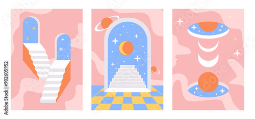 Surrealism Poster Set. Geometric Ladder, Abstract Shapes, Moon Light. Vector Illustration in Minimal Style.