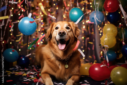 Surrounded by a festive explosion of balloons and confetti, a playful dog dances in delight, embodying the exuberant spirit of the lively celebration