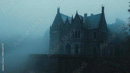 Surrounded by swirling fog, the old mansion's gothic spires loom like ghostly fingers reaching into the night, creating an atmosphere of haunting mystery.