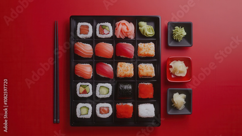 Sushi and sashimi on black platter, with chopsticks beside them, arranged in an overhead view against a contrasting red background.