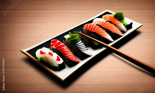 Sushi food variation and chopstick on black plate wooden table japanese. Generative AI