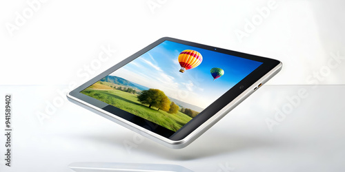 Suspended digital tablet with interactive interface on an isolated white background concept as A digital tablet floating mid air with an interactive interface displaying on the screen all isolated on