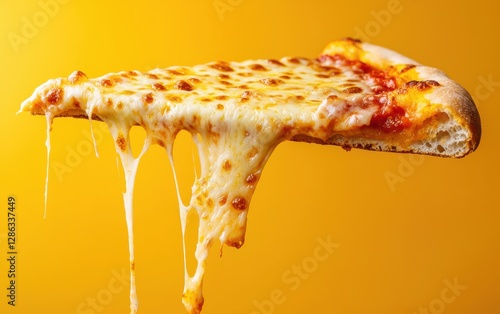 Suspended pizza slice with melting cheese on a bold yellow background