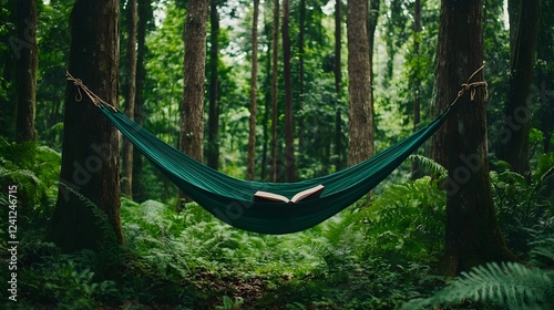 Suspended Tranquility:A Hammock Amid the Lush Forest Inviting Relaxation and Reading