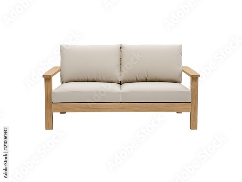 Sustainable and Wooden product. Modern wooden sofa with beige cushions, perfect for stylish interiors.