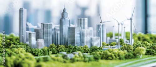 Sustainable city model with modern buildings and wind turbines showcasing green energy and ecofriendly urban planning for a cleaner future