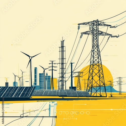 Sustainable Energy Landscape: A Fusion of Solar, Wind, and Transmission Infrastructure in Stylized Design