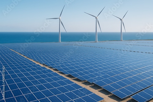 Sustainable energy solutions with solar panels and wind turbines by the sea in a coastal renewable energy farm, symbolizing clean power generation