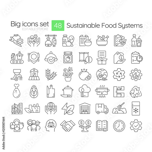 Sustainable food systems linear icons set. Ecology preservation, waste recovery. Production, consumption. Customizable thin line symbols. Isolated vector outline illustrations. Editable stroke