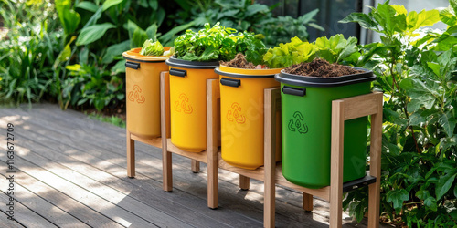 Sustainable Living Organic composting concept, Colorful compost bins on a wooden stand, surrounded by lush greenery, promoting eco-friendly practices and sustainable gardening.