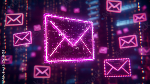 swarm of glowing digital envelopes floats in a dark cyberspace, symbolizing virtual communication and data exchange. The image represents connectivity, digital privacy, and the flow of information