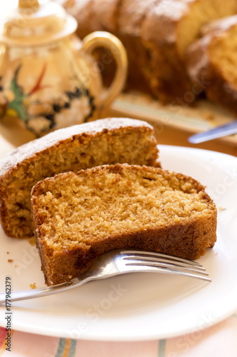 sweet almond homemade cake on white plate with coffee