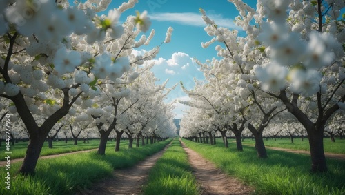 Sweet cherry trees in full bloom forming a vibrant orchard covered in white flowers