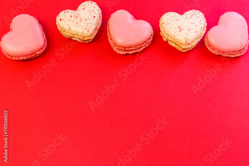 Sweet heart shaped macaroons on red background. Top view, copy space. Valentine Day concept