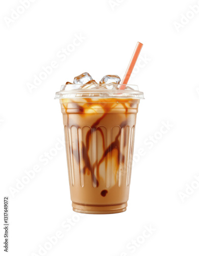 Sweet Iced Caramel Macchiato Coffee Drink with Drizzle Pattern in Clear Plastic Cup with Ice Cubes and Coral Pink Straw Isolated on Transparent and White Background